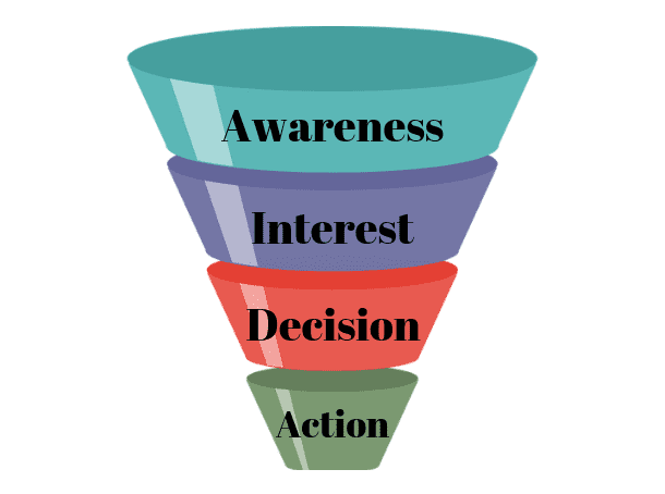 The most bare-bones marketing sales funnel is made up of four stages (awareness, interest, decision, and action).