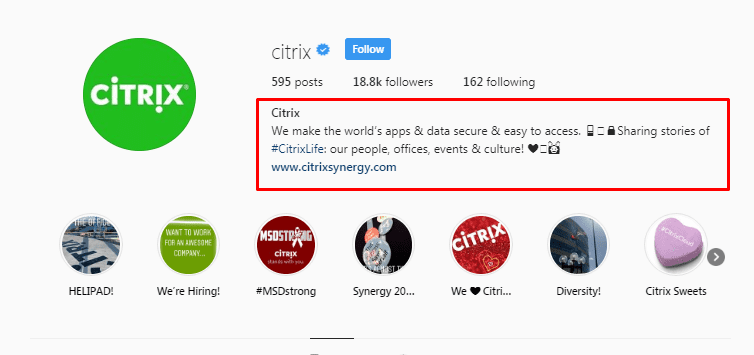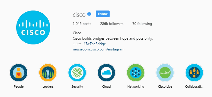 Remember, you only have a max of 150 characters to let your people know what you do and how you do it, so make sure that you get your point across fast. You can include brandable hashtags like Cisco's #BeTheBridge to make your profile stand out more. Alternatively, if it's right for your audience, consider adding a few emojis too.